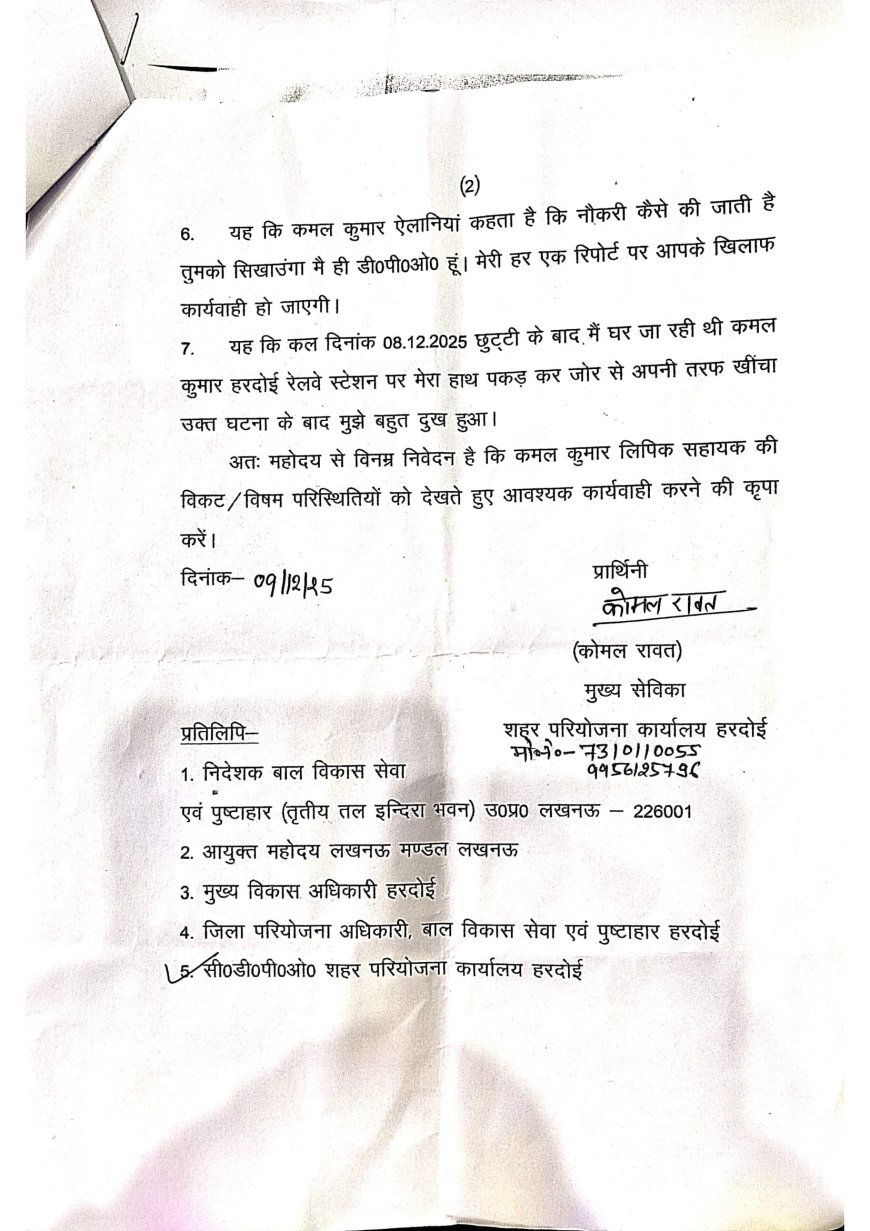 लिपिक सहायक ने गलत ढ़ंग से छुआ और .... हरदोई की महिला मुख्य सेविका ने लगाए आरोप, मेहनत कर सपनों को उड़ान देने वाली महिलाओं पर ये कैसी बर्बरता?