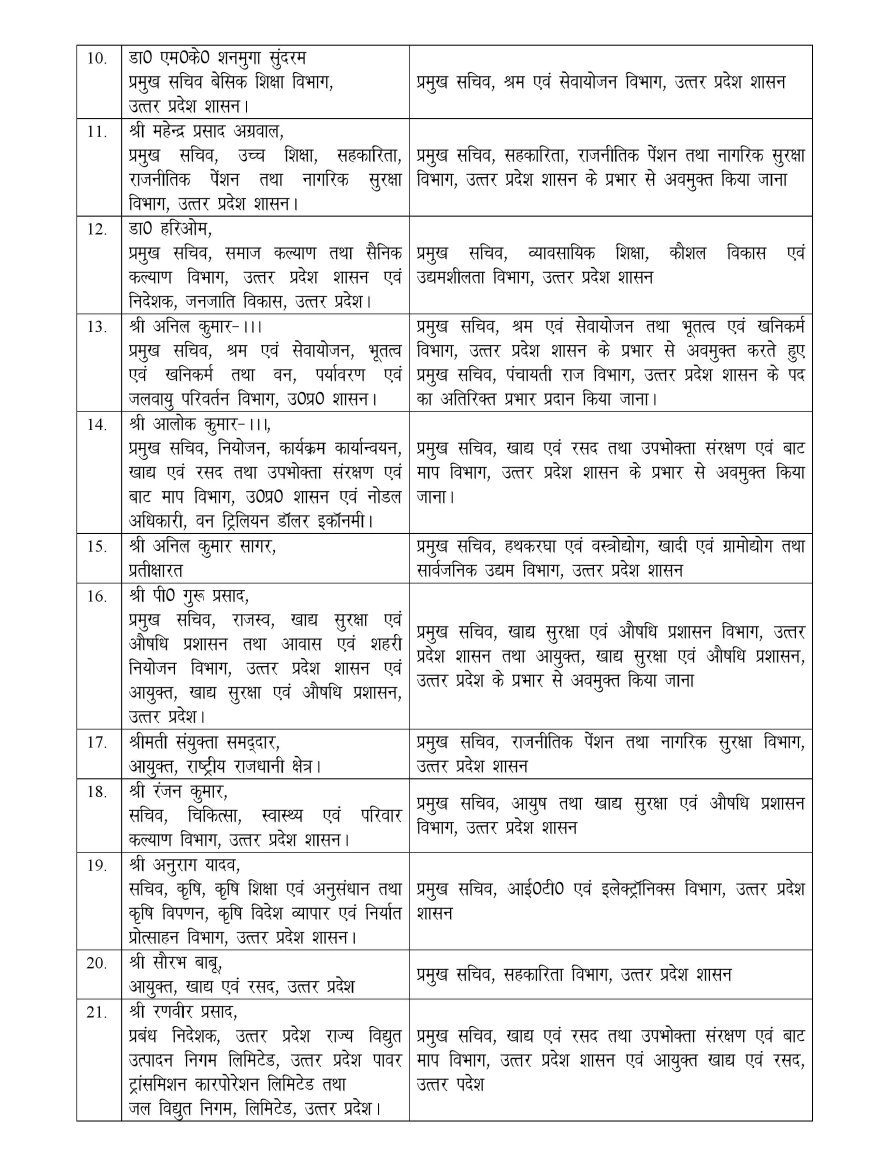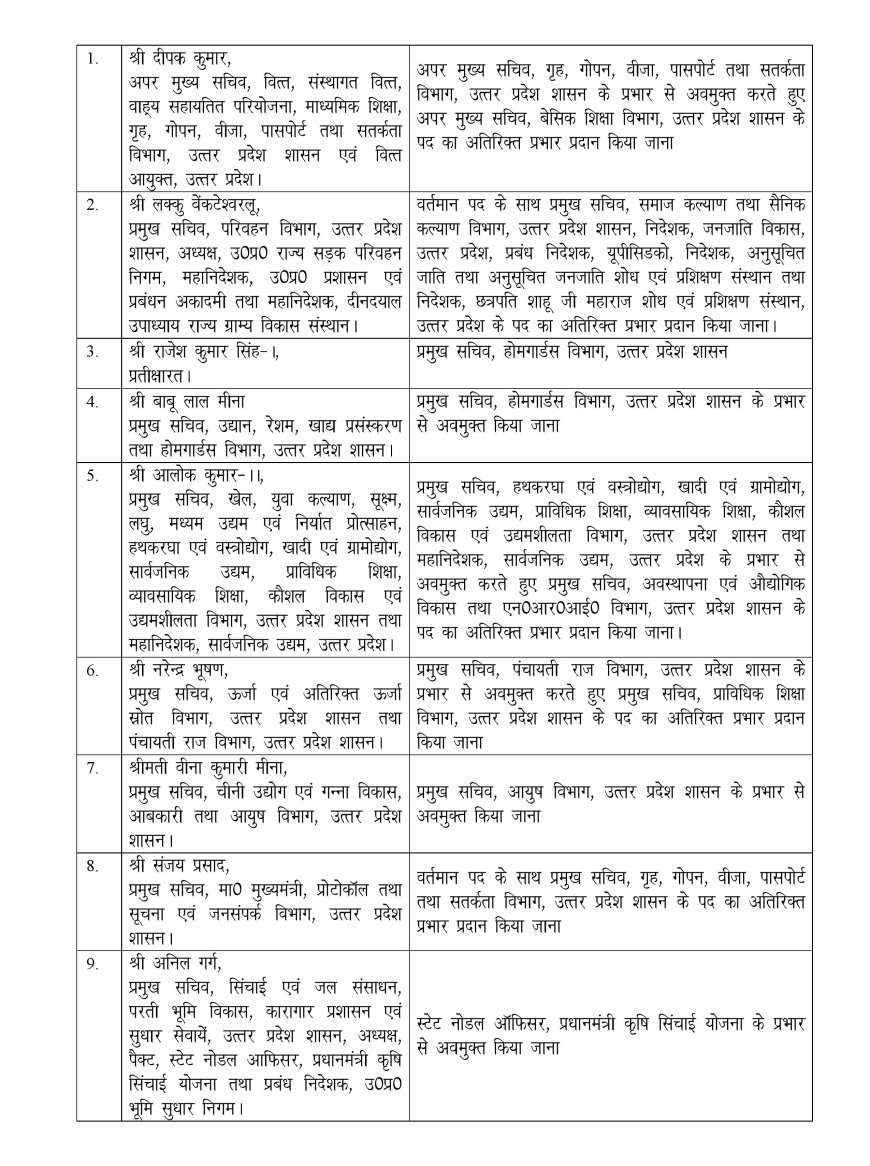 एल वेंकटेश्वरलू प्रमुख सचिव परिवहन, अध्यक्ष राज्य सड़क परिवहन निगम, महानिदेशक प्रशाएन एवं प्रबंधन अकादमी तथा महानिदेशक दीनदयाल उपाध्याय राज्य ग्राम्य विकास संस्थान से प्रमुख सचिव समाज कल्याण तथा सैनिक कल्याण, प्रबंध निदेशक यूपीसिडको, निदेशक अनुसूचित जाति तथा अनुसूचित जनजाति शोध एवं प्रशिक्षण संस्थान और निदेशक छत्रपति शाहू जी महाराज शोध एवं प्रशिक्षण संस्थान उत्तर प्रदेश का अतिरिक्त प्रभार दिया गया है। राजेश कुमार प्रथम को प्रतीक्षरत से प्रमुख सचिव होमगार्ड बनाया गया है। बाबू लाल मीना प्रमुख सचिव उद्यान रेशम खाद्य प्रसंस्करण तथा होमगार्ड से होमगार्ड का अतिरिक्त प्रभार से वापस ले लिया गया है।