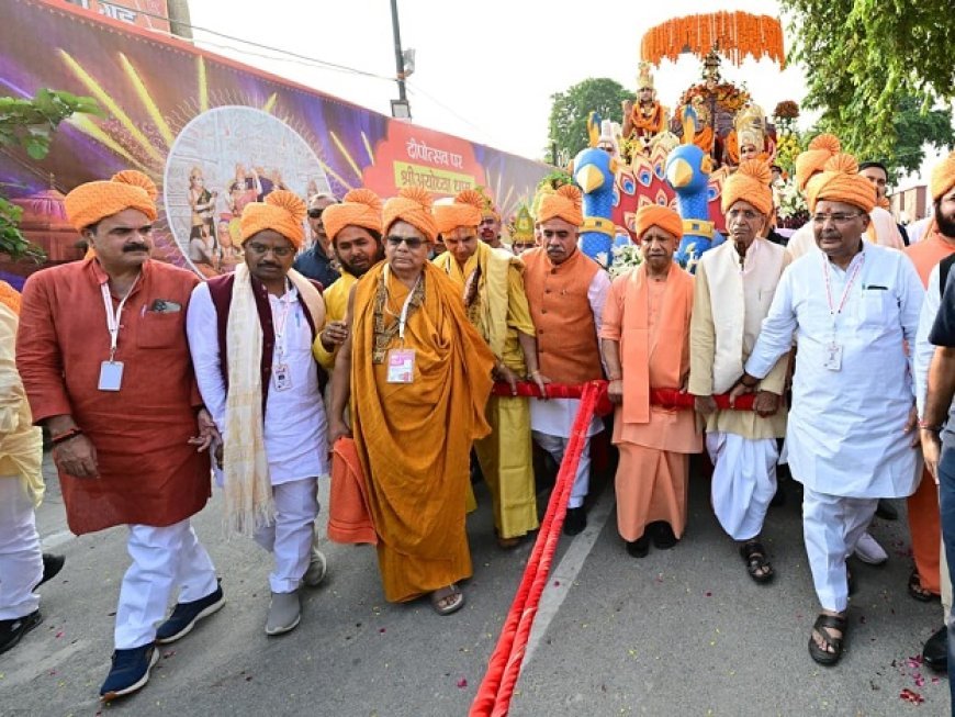 - मुख्यमंत्री ने किया भगवान श्रीराम-मां सीता का पूजन, हेलीकॉप्टर से हुई पुष्प वर्षा, मुख्यमंत्री योगी ने खींचा रथ