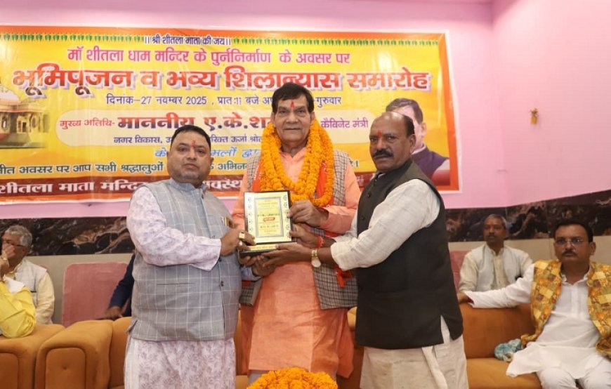 लखनऊ: नगर विकास एवं ऊर्जा मंत्री ए. के. शर्मा ने अपने मऊ प्रवास के दौरान आज ऐतिहासिक एवं आस्था के प्रमुख केंद्र शीतला माता मंदिर में व्यापक पुनर्निर्माण एवं सौंदर्यीकरण कार्य का विधिवत भूमि पूजन किया। भूमि पूजन के साथ ही मंदिर के नए स्वरूप के निर्माण कार्य का शुभारंभ हो गया है, जिसके पूर्ण होने के बाद यह मंदिर न केवल धार्मिक पर्यटन का प्रमुख केंद्र बनेगा, बल्कि स्थानीय विकास को भी नई गति देगा।मंत्री श्री शर्मा ने बताया कि नगर विकास विभाग की महत्वाकांक्षी वंदन योजना के अंतर्गत शीतला माता मंदिर के जीर्णोद्धार के लिए 2 करोड़ रुपये का विशेष योगदान स्वीकृत किया गया है। इस राशि से मंदिर परिसर का विस्तार, श्रद्धालुओं के बैठने एवं आवागमन की उचित व्यवस्था, बेहतर रोशनी, पेयजल, पार्किंग व सुरक्षा सुविधाओं का निर्माण किया जाएगा।
