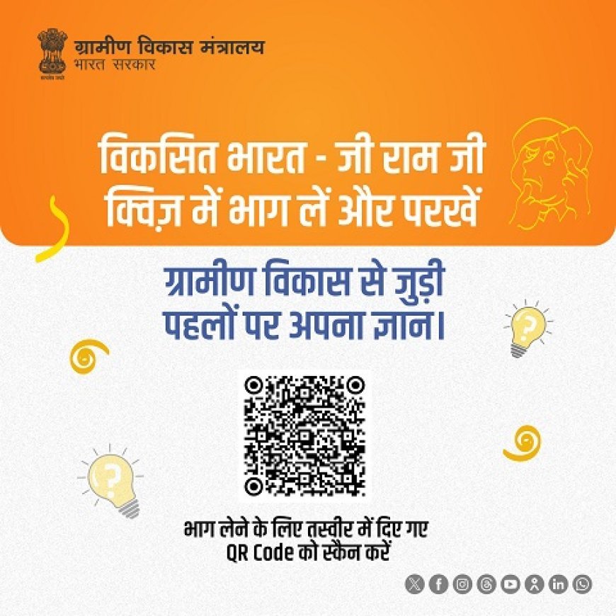 वीबी -'जी राम जी' क्विज़ प्रतियोगिता: ग्रामीण विकास योजनाओं के प्रति जागरूकता बढ़ाने के लिए यह राष्ट्रीय स्तर की ऑनलाइन प्रतियोगिता आयोजित की जा रही है। विजेताओं को डिजिटल प्रमाणपत्र और केंद्रीय मंत्रियों से मिलने का अवसर मिलेगा।