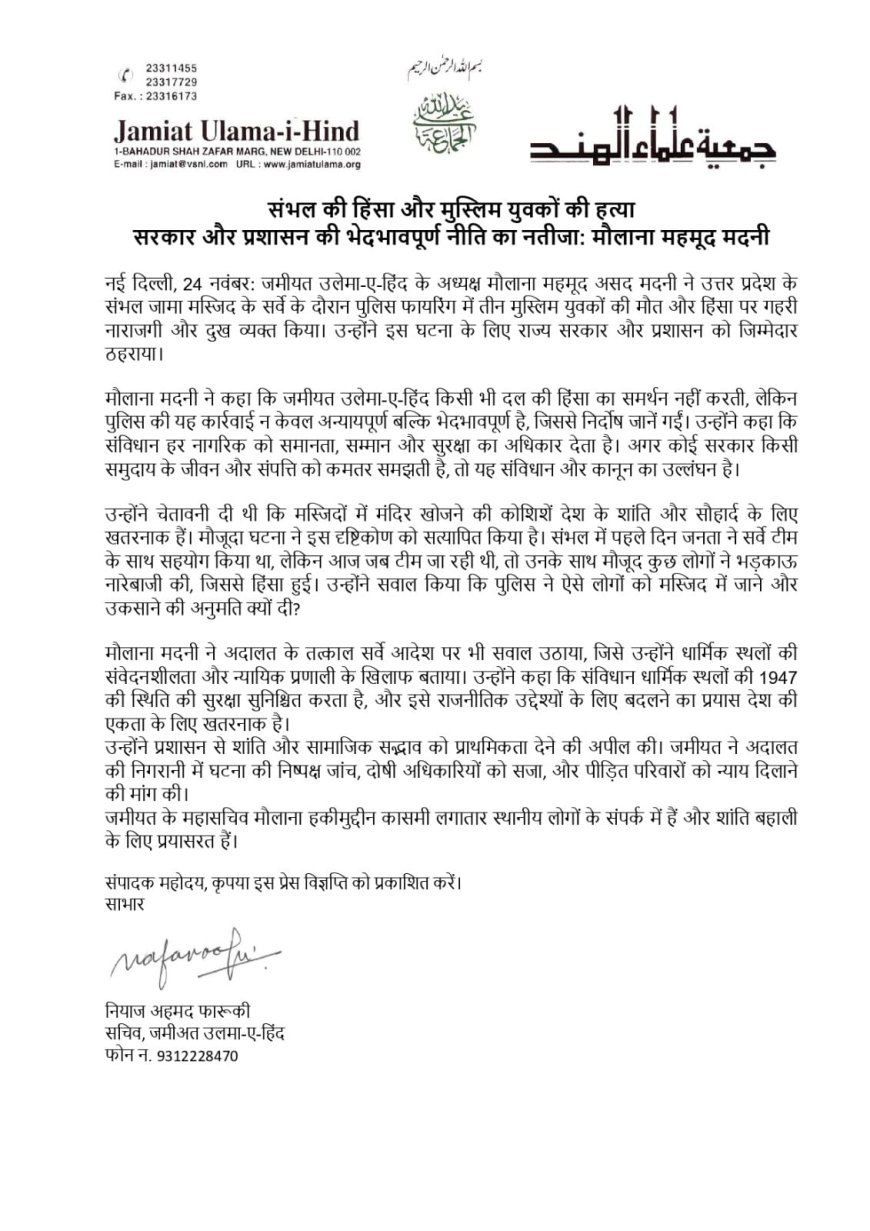 उन्होंने प्रशासन से शांति और सामाजिक सद्भाव को प्राथमिकता देने की अपील की। जमीयत ने अदालत की निगरानी में घटना की निष्पक्ष जांच, दोषी अधिकारियों को सजा, और पीड़ित परिवारों को न्याय दिलाने की मांग की।