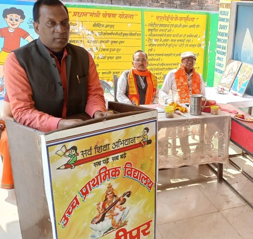 कार्यक्रम का शुभारंभ मां शारदा के चित्र के समक्ष दीप प्रज्वलन और पूजन से हुआ। तत्पश्चात विद्यालय के शिक्षकों द्वारा मुख्य अतिथियों—अनंत कुमार अग्रवाल, चौधरी देवेंद्र सिंह तेवतिया, अजय कुमार शर्मा एवं मीनू रस्तोगी—का पगड़ी पहनाकर, माल्यार्पण कर तथा श्रीमद् भगवत गीता भेंट कर सम्मान किया गया। कार्यक्रम को संबोधित करते हुए भारतीय इतिहास संकलन समिति के जिला अध्यक्ष अजय कुमार शर्मा ने कहा कि माता-पिता चलते-फिरते देव हैं और सबसे बड़े तीर्थ हैं। उन्होंने श्री रामचरितमानस से भगवान श्रीराम के आदर्शों का उल्लेख करते हुए विद्यार्थियों को माता-पिता के प्रति कर्तव्यों का बोध कराया और आज्ञा-पालन का सामूहिक संकल्प दिलाया। जिला महिला प्रमुख मीनू रस्तोगी ने माता-पिता की महिमा का वर्णन करते हुए कहा कि जो व्यक्ति अपने माता-पिता का सम्मान करता है, उस पर ईश्वरीय कृपा सदैव बनी रहती है। चौधरी देवेंद्र सिंह तेवतिया ने इस पहल की सराहना करते हुए इसे प्रत्येक विद्यालय और घर-घर में प्रतिवर्ष आयोजित करने की आवश्यकता बताई। अपने अध्यक्षीय उद्बोधन में उत्तर प्रदेश व्यापार मंडल के प्रांत संगठन मंत्री अनंत कुमार अग्रवाल ने कहा कि आज के बच्चे भविष्य के देश-निर्माता हैं। उन्हें संस्कारयुक्त शिक्षा देना शिक्षकों के साथ-साथ माता-पिता की भी जिम्मेदारी है। उन्होंने उच्च प्राथमिक विद्यालय भवानीपुर के शिक्षक मंडल की प्रशंसा करते हुए विद्यालय को ब्लॉक ही नहीं, जनपद में भी यशस्वी बताया। कार्यक्रम के भावुक क्षणों में विद्यार्थियों ने पूजा-थाली के साथ अपने माता-पिता का रोली-चावल से तिलक किया, माल्यार्पण किया, उपहार भेंट किए और चरण-स्पर्श कर आशीर्वाद लिया। जीवनभर आज्ञा-पालन और कर्तव्य-निष्ठा का संकल्प भी लिया गया। इस अवसर पर तृषा लोधी और सेवाराम सिंह यादव ने भी अपने विचार रखे। कार्यक्रम की अध्यक्षता भारतीय इतिहास संकलन समिति के संरक्षक अनंत कुमार अग्रवाल ने की, जबकि संचालन विद्यालय के प्रधानाध्यापक अतुल कुमार शर्मा ने किया।